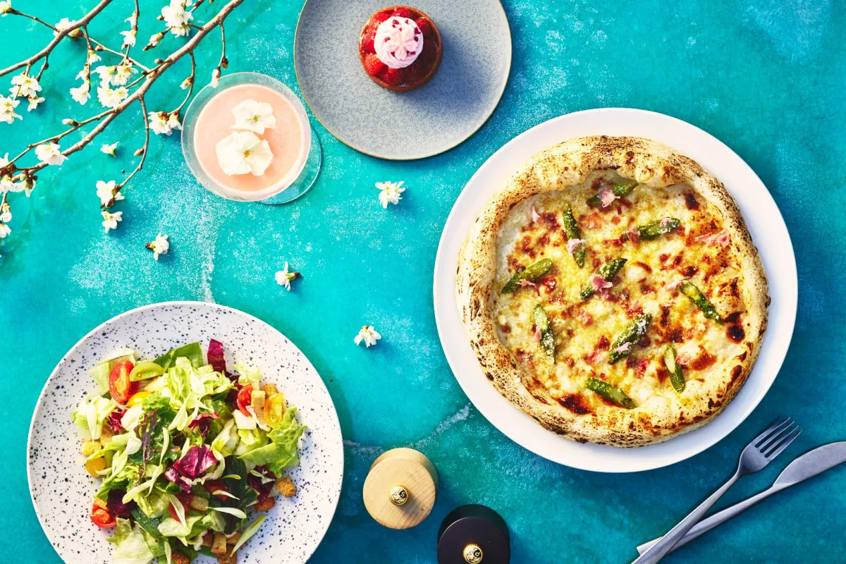 「Hanami Garden」では、11階のオールデイダイニング「Gallery 11」のテラス席から桜と共に春の風を感じることができる絶好のロケーションがあります。エグゼクティブシェフの手によるピザは、桜の花びらが生地に練り込まれ、アスパラガスとチーズと組み合わさることで、春らしい風味を引き立てています。