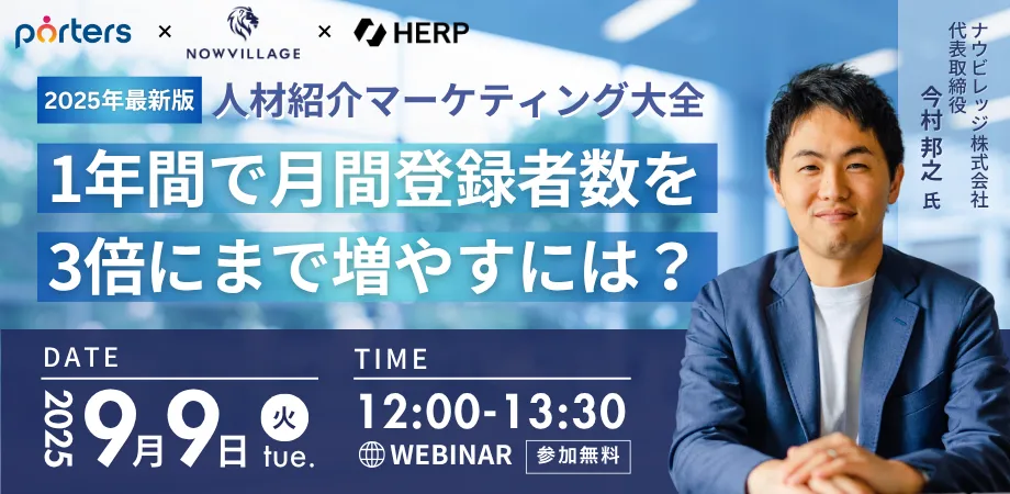 ポーターズ株式会社が主催する、オンラインセミナー「【2025年版】人材紹介マーケティング大全」が2025年9月9日(火)に開催されます。このセミナーでは、特に人材紹介業界の経営者やその担当者を対象に、登録者数を1年間で3倍に増加させるための具体的なマーケティング施策が紹介されます。