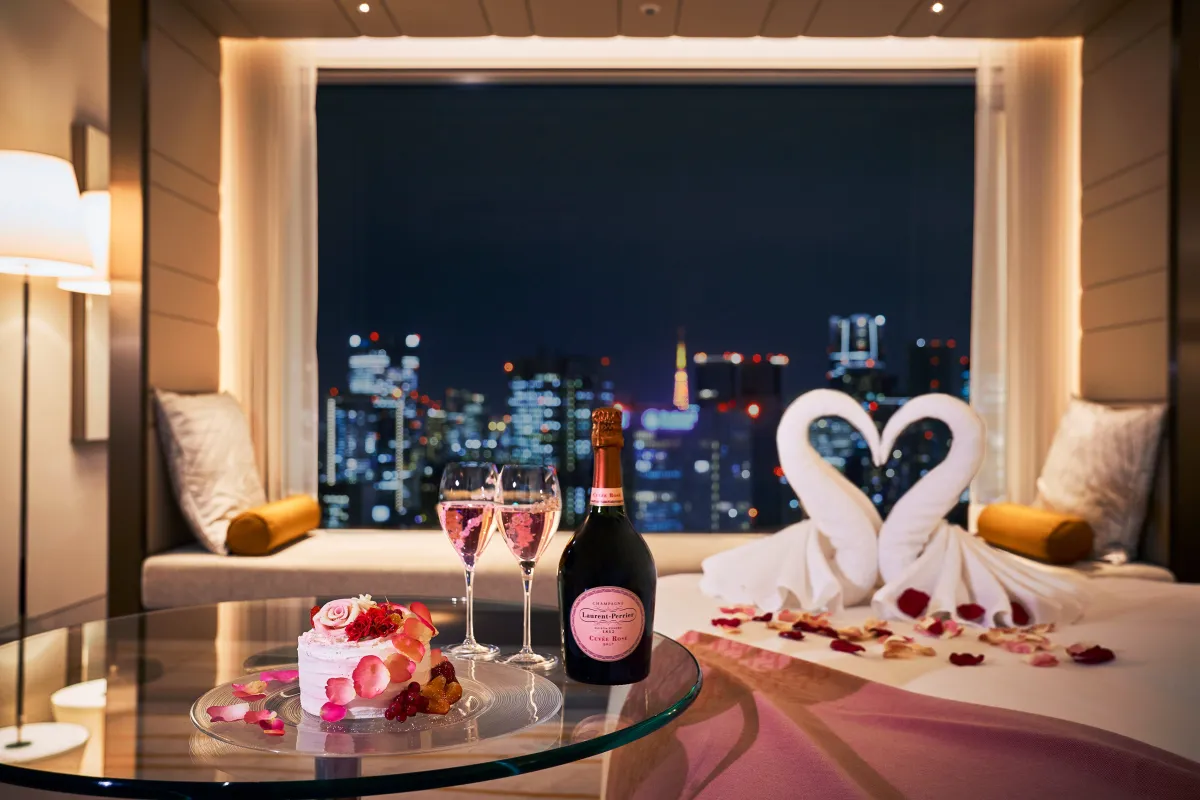 当ホテルは高層階に位置し、客室からは東京タワーや東京スカイツリーなど、都心の美しい夜景を一望できます。この素晴らしい背景の中で、大切な方と共に特別なクリスマスをお過ごしいただけます。また、客室にはローズペダルのアートやタオルアートが施されており、華やかな雰囲気を演出しています。
