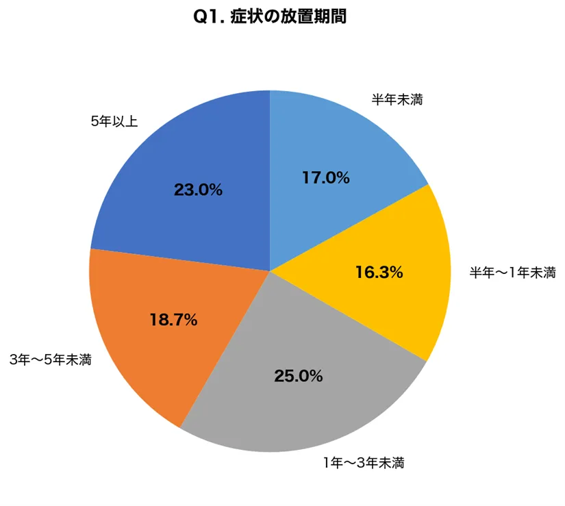 調査結果によると、眼瞼下垂の症状を1年以上放置している人の74.3%が、慢性的な頭痛や肩こり、眼精疲労を併発しています。まぶたを開けようと無意識におでこの筋肉を使い続けることが、これらの症状を引き起こす原因となっています。
