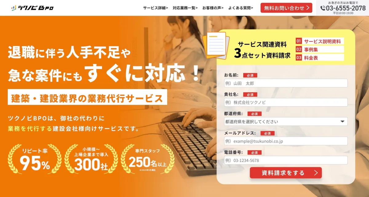 「ツクノビBPO」は、建築・建設業界に特化した業務代行サービスで、業界特有の複雑な業務を効率化し、企業が本来の業務に集中できる環境を提供することを目的としています。導入企業数は300社を超え、実績も豊富です。具体的な業務内容には、書類作成、施工管理、図面作成、積算、写真データ整理などが含まれ、業務を定額制で依頼できる点も魅力です。