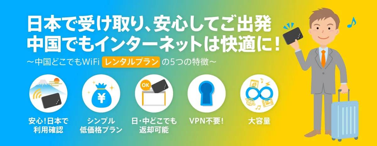 「中国どこでもWiFiモバイルプラン」は持ち運び可能なポケット型WiFiです。これは特に観光や出張など、短期滞在の方に最適です。借りたWiFiルーターを日本で受け取り、中国で利用し、最後に返却できる手軽さも魅力です。