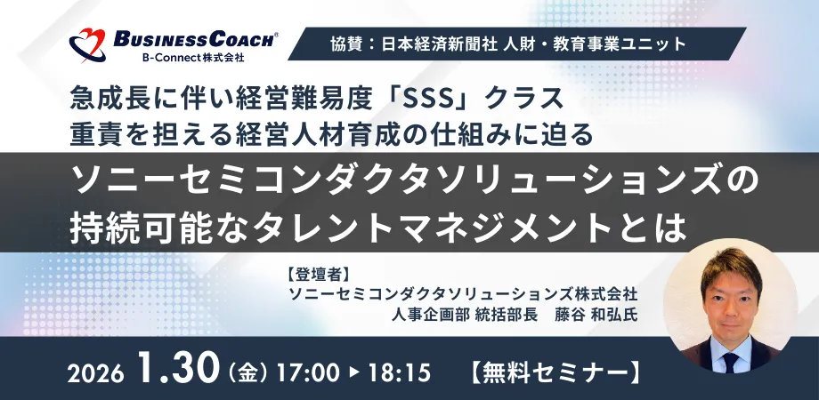 ビジネスコーチ株式会社が主催する特別セミナーが、2026年1月30日(金)に開催されます。このセミナーの目玉は、ソニーセミコンダクタソリューションズ株式会社から、人事企画部 統括部長の藤谷和弘氏を招くことです。伊豆においては、人材育成の最新の手法や成功事例を直に学ぶ貴重な機会です。
