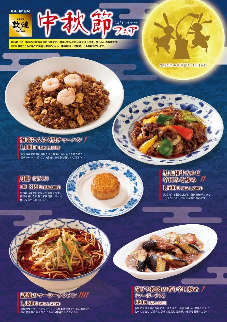 敦煌の中秋節フェアは、家族で楽しむ秋の味覚を豊富に取り揃えた、特別な機会です。ぜひこの機会に訪れて、特製メニューを味わい、思い出に残るひとときをご堪能ください。スタッフ一同、皆さまの来店をお待ちしております。