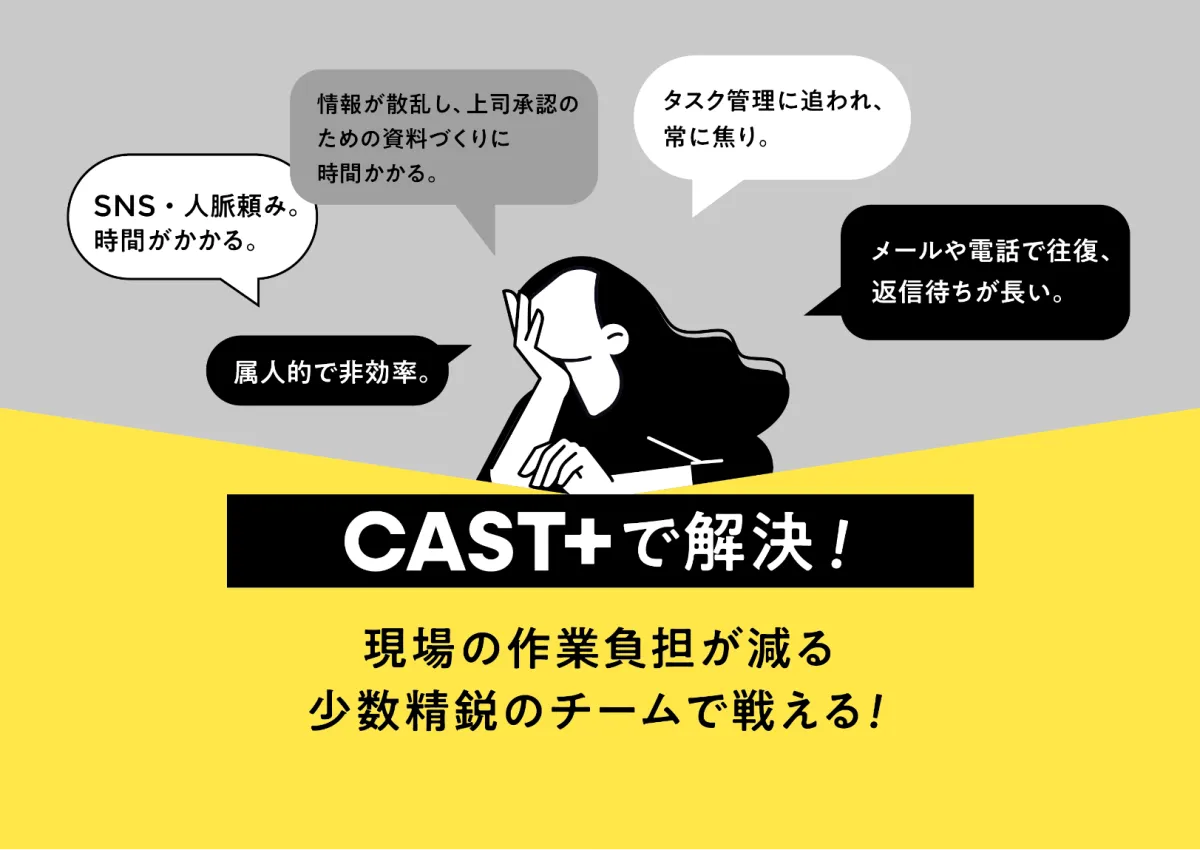 CAST+は、映像制作においてキャストを起用する際、制作会社と芸能事務所が効果的に結びつくためのプラットフォームです。これは、業界内での多くの声を反映し、2025年9月に正式にリリースされました。キャスティング業務の「探す」「調整する」「決める」というステップをデジタル化することで、業務の負担を大幅に軽減し、少数のチームでも創造的な時間を増やせる環境を整えることを目指しています。