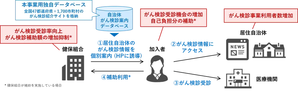 このプログラムでは、全国47都道府県に加えて、1,700以上の市町村におけるがん検診事業のデータベースを構築しており、加入者は自分の居住する自治体の情報を簡単に取得できます。これにより、がん検診の受診機会を気軽に増やすことが可能となります。