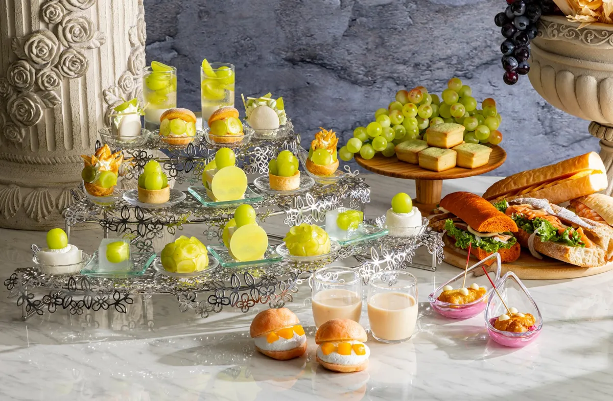 このシャインマスカットは、昼夜の寒暖差が厳しい山梨の盆地で育まれた、一粒一粒が豊かな甘みを持つ特別なブドウです。ヒルトン東京お台場では、この地域のJAグループの協力を得て、まさに秋の恵みともいえる美しい果実を使用しています。豊かな香りと甘みを兼ね備えたシャインマスカットを主役とした全9種類のスイーツが堪能でき、その魅力を存分に引き出したメニューがそろっています。