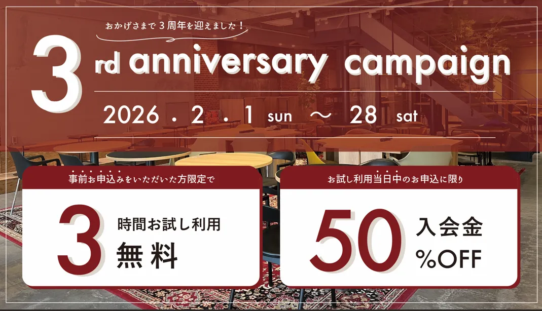 立川市に位置する「me:rise立川」は、2023年にオープン以来、急速に人気を集めているコワーキングスペースです。JR立川駅北口から徒歩わずか4分の便利な立地にあり、フリーランスやリモートワーカーに最適な場所として支持されています。2026年2月にはオープン3周年を迎え、その記念として「3時間無料体験および入会金半額キャンペーン」を実施しています。