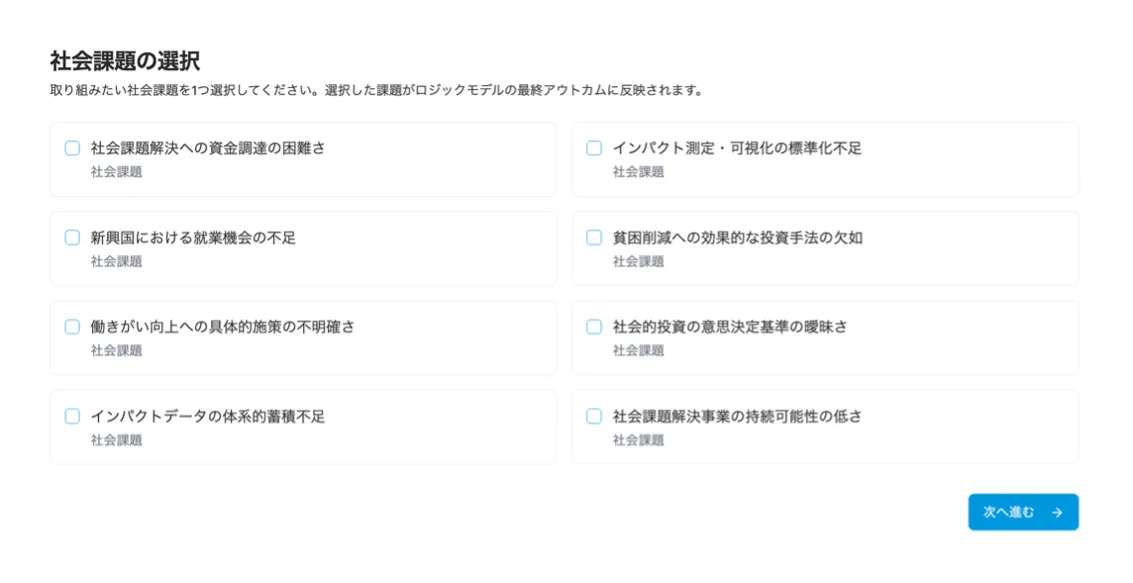 - - ロジックモデル自動生成・編集機能:選定した社会課題を基に、最適なロジックモデルを自動生成します。
