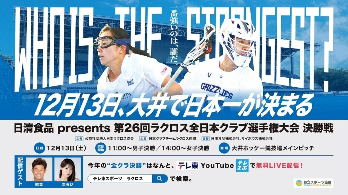 2028年にロサンゼルスで復活するラクロス。この注目のスポーツが、日本での人気を高めつつある中、12月13日(土)に東京都の大井ふ頭中央海浜公園ホッケー競技場で行われる「第26回ラクロス全日本クラブ選手権大会」決勝戦の模様をライブ配信します。