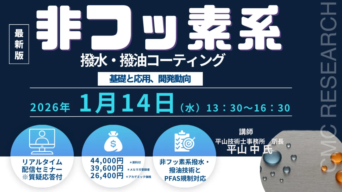 2026年1月14日(水)13:30から16:30に行われる「非フッ素系撥水・撥油コーティングの基礎と応用、開発動向」セミナーについてお知らせします。このセミナーは、(株)シーエムシー・リサーチの主催で、Zoomを介したライブ配信形式で実施されます。