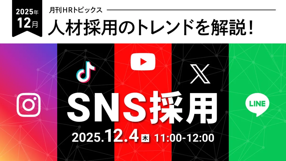 株式会社天職市場が2025年12月4日(木)に無料で開催するオンラインセミナー「人材採用のトレンドを解説!月刊HRトピックス2025年12月『SNS採用』」。今回は、採用市場におけるSNSの重要性を掘り下げます。 本セミナーは、企業の人事担当者や採用担当者を対象にした内容となっており、特にZ世代の求職者を中心に、SNSの活用についてリアルな視点で解説します。