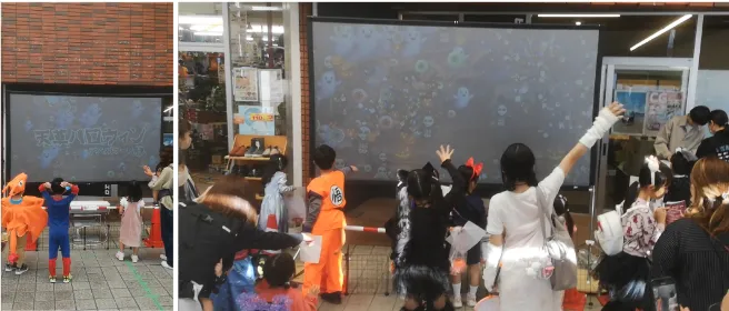 当日は晴れ渡る空の下、多くの人々が会場に足を運びました。デジタルアート天草のブースは人気を集め、特に子どもたちにとって刺激的な空間となりました。インタラクティブなハロウィン映像がプロジェクションスクリーンで展開され、来場者の動きに反応しリアルタイムでカボチャやお化けのアイテムが弾ける仕掛けは、大好評でした。