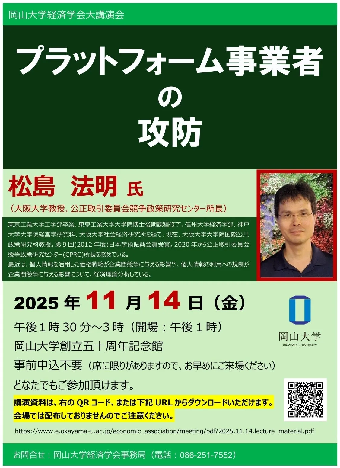 2025年11月14日(金)、岡山大学津島キャンパスの創立五十周年記念館にて、オンラインサービスやアプリの背後に潜むプラットフォーム事業者の競争に焦点を当てた大講演会が行われます。本講演会は「プラットフォーム事業者の攻防」というテーマで、著名な講師松島法明教授をお招きし、私たち日常生活で利用しているネットサービスがどのように形成され、競争にさらされているのかについて深く掘り下げて解説します。