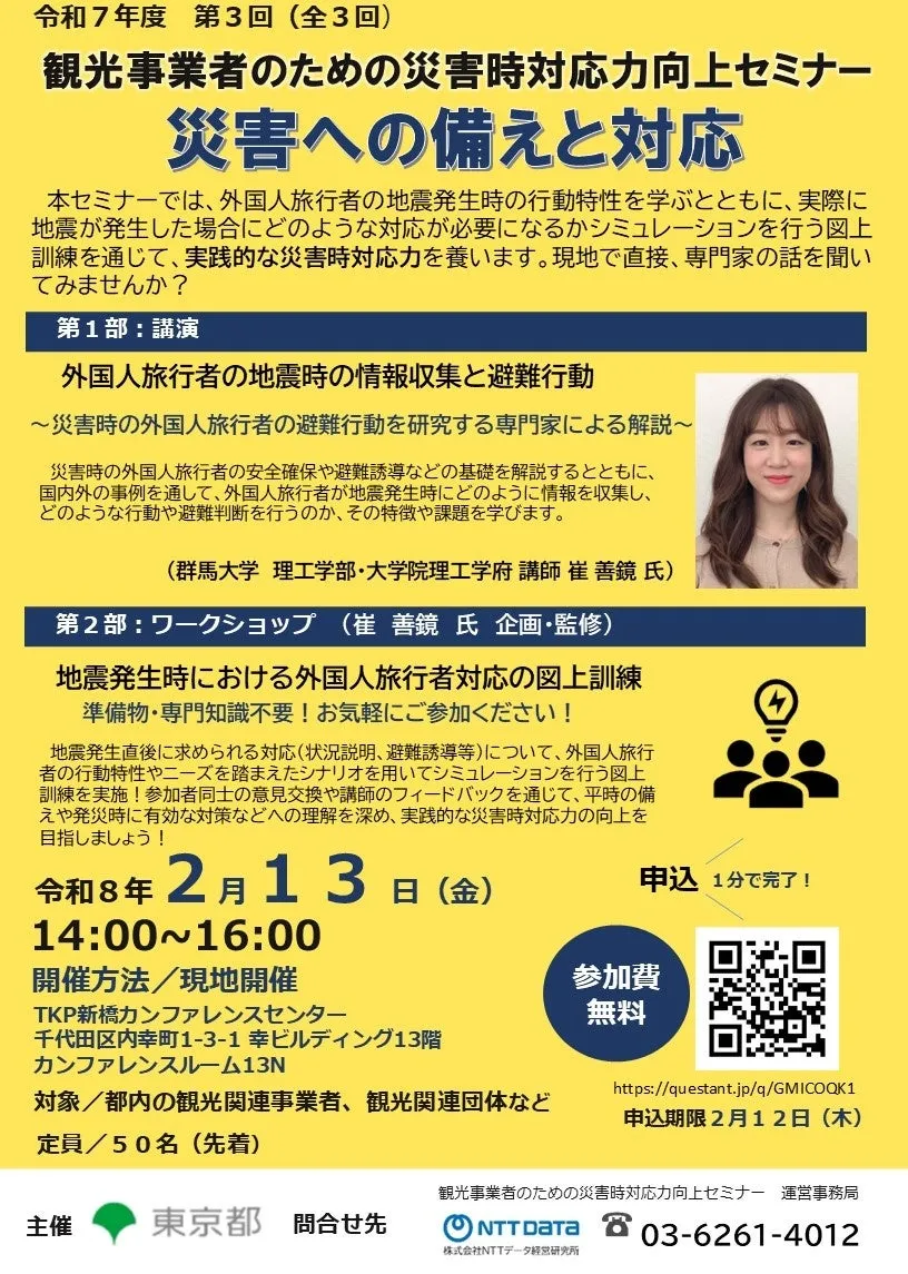 東京都では、令和8年2月13日(金)に外国人旅行者に対する災害時の取り組みを深化させるためのセミナーを開催します。このセミナーでは、観光業に携わる事業者が外国人旅行者の安全確保に必要な知識やノウハウを学ぶことができます。災害時において、正確かつ迅速な情報提供が求められる今、特に重要な機会です。