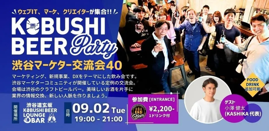 2025年9月2日(火)19:00、渋谷道玄坂の「KOBUSHI BEER LOUNGE & BAR」で、特別な交流イベント「KOBUSHI BEER NIGHT」が開催されます。このイベントは、デジタルマーケティングや新規事業、DXに関心を持つビジネスパーソンたちが集まり、真摯な意見交換や人脈形成を行うための絶好の機会です。