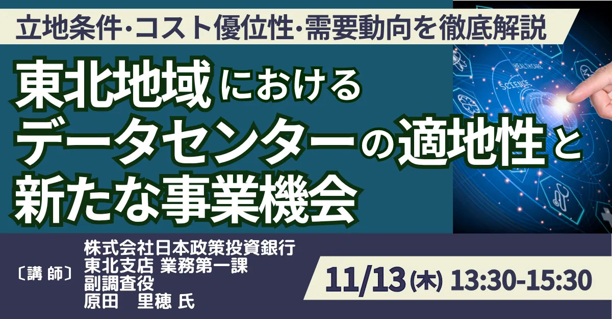 株式会社日本計画研究所(JPI)は、11月13日(木)に「東北地域におけるデータセンターの適地性と新たな事業機会」と題したセミナーを開催します。このセミナーでは、データセンターのニーズが高まる中で、特に東北地域における事業機会と立地条件について詳しく解説されます。