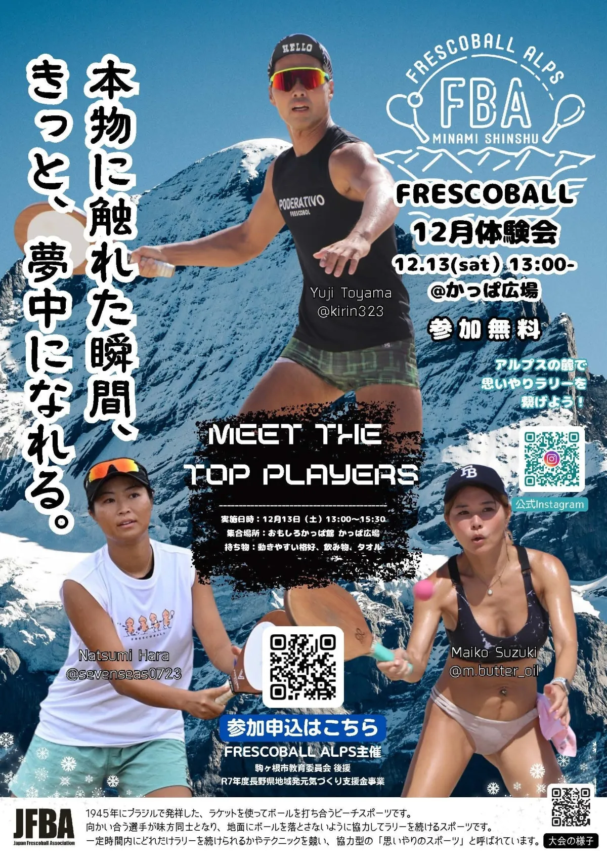 今回の体験会には、2025年度の日本代表に選出された岡井花子選手と宮山有紀選手が11月15日に、また12月13日には同じく日本代表の外山祐次選手、鈴木麻井子選手、さらには『FRESCOBALL JAPAN TOUR 2025』のミックス年間ランキング5位の原七海選手が参加予定です。各日とも、実力派の選手から直接指導を受けられる貴重なチャンスです。