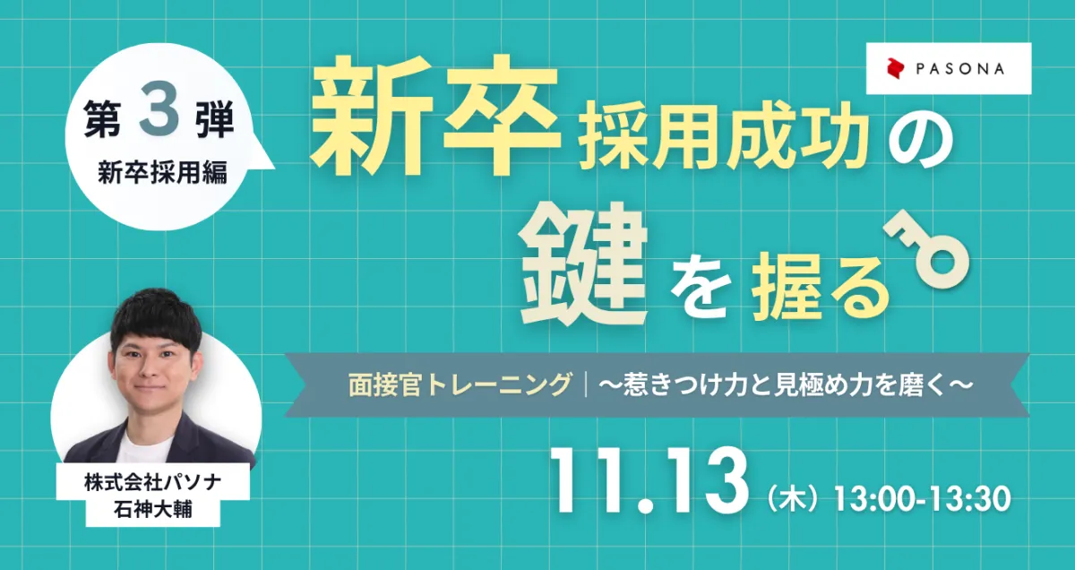 新卒採用を成功させるために必要なスキルを磨く、オンラインウェビナーが11月13日(木)に開催されます。主催は株式会社パソナで、本セミナーは経営層や人事・採用担当者を対象としています。このウェビナーでは「面接官トレーニング~惹きつけ力と見極め力を磨く~」というテーマのもと、より効果的な採用プロセスを実現するための実践的な技術や知見を学びます。