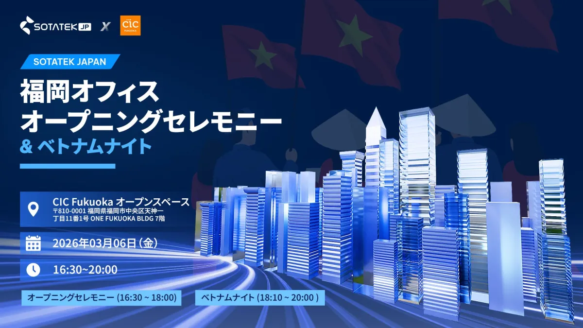 2026年3月6日(金)、福岡市のCIC Fukuokaにて、SotaTek Japanによる福岡オフィスのオープニングセレモニーと「ベトナムナイト」が開催されます。このイベントは、福岡オフィスの正式開設を祝うとともに、日越文化交流を促進することが目的です。