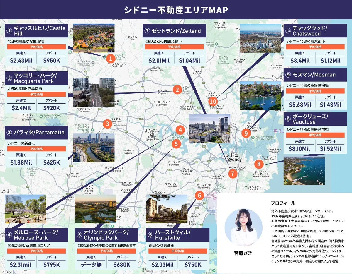 - - パラマタ: 経済成長著しいエリアで、平均戸建て価格は約1.88ミリオンドル(約1億8,178万円)。