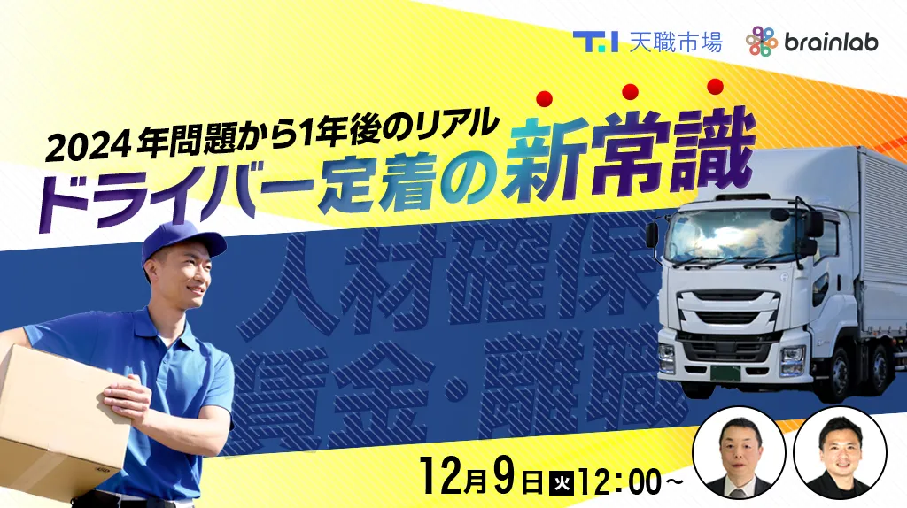 2024年問題が施行されてから、物流・運送業界は深刻なダメージを受けています。特にドライバー不足は顕著で、これに起因する倒産件数も過去最多を記録しています。「仕事はあるがドライバーがいない」という状況が続いており、業界全体が人手不足に直面しています。求人コストが肥大する中で応募者が集まらず、採用後の早期離職も伴い、持続可能な事業成長が困難な状況です。そこで、株式会社ブレイン・ラボと株式会社天職市場が共同で開催するオンラインセミナーでは、高騰する採用コストを抑えながらも、ドライバーの定着率を向上させる新しい戦略やその具体的な手法を紹介します。