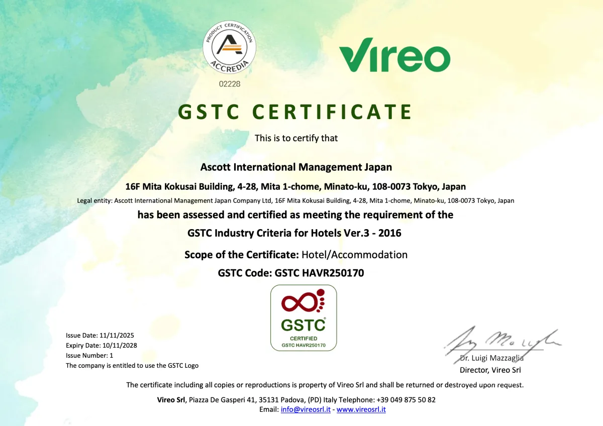 GSTCは持続可能な観光と旅行のための国際基準を設定しており、アスコットの全プロパティが今回の認証を達成したことは、特に注目されるべき成果です。認証の獲得は、アスコットが地域社会と環境に配慮した責任ある運営を推進している証でもあり、その努力が国際的にも高く評価されています。