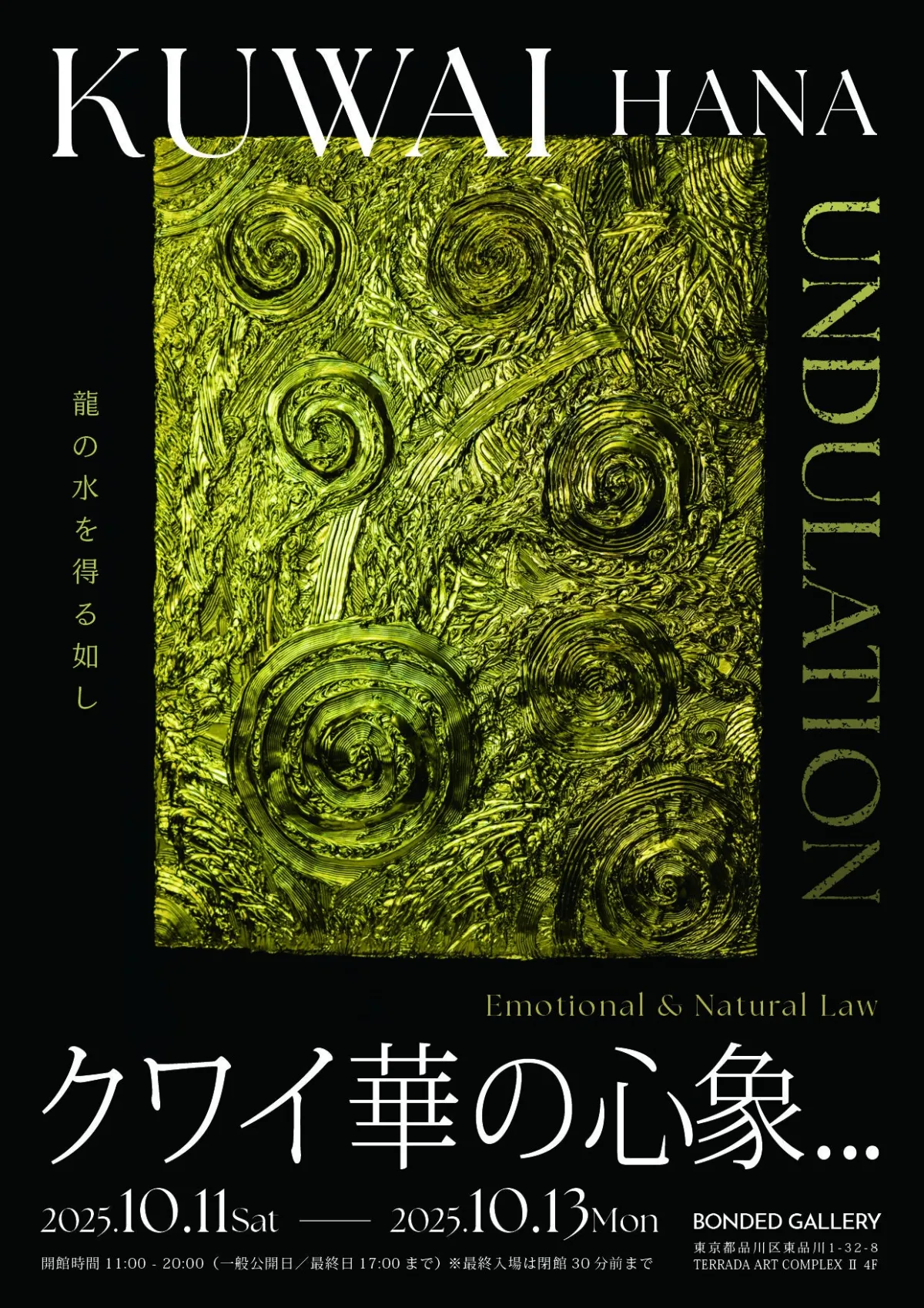 現在、金属アートの新たな風を吹き込むアーティストとして注目を集めているクワイ華の個展『UNDULATION』が、2025年10月11日(土)から13日(月・祝)まで、天王洲アイルにあるBONDED GALLERYで開催されます。この展示では、クワイ華が手掛ける唯一無二の作品群の数々が披露され、特に国際公募展「#Gold」展で最優秀賞を受賞した「MANDALA F8号」を中心に、金属の美がどのように情熱を宿しているのかを見ることができます。