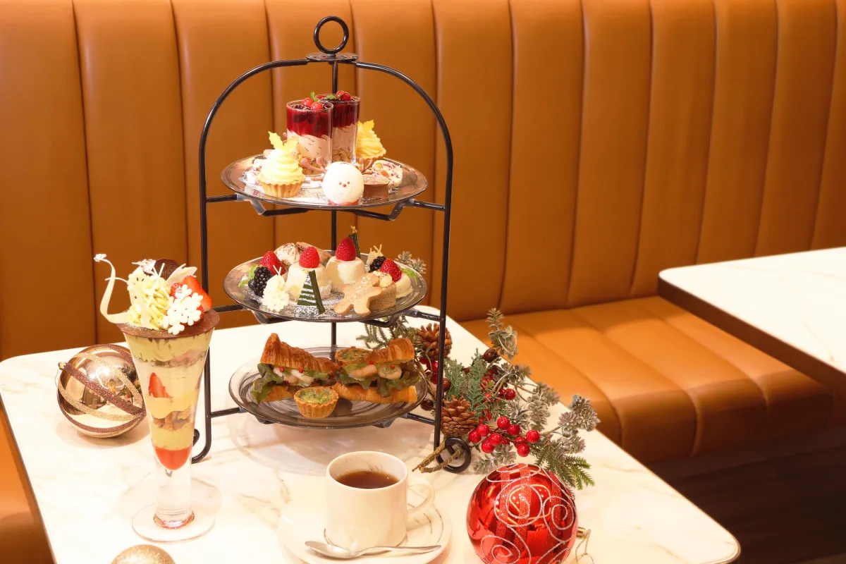 まず注目したいのは、クリスマスシーズンにぴったりな「クリスマスアフタヌーンティーセット」です。トナカイやクリスマスツリーをモチーフにした華やかなスイーツの数々が、冬らしい味わいを引き立てています。上段には赤ワインのヴェリーヌやさつま芋のモンブラン、そしてトナカイの形をしたマカロンが並び、あたたかみのあるクリスマスの雰囲気が漂います。