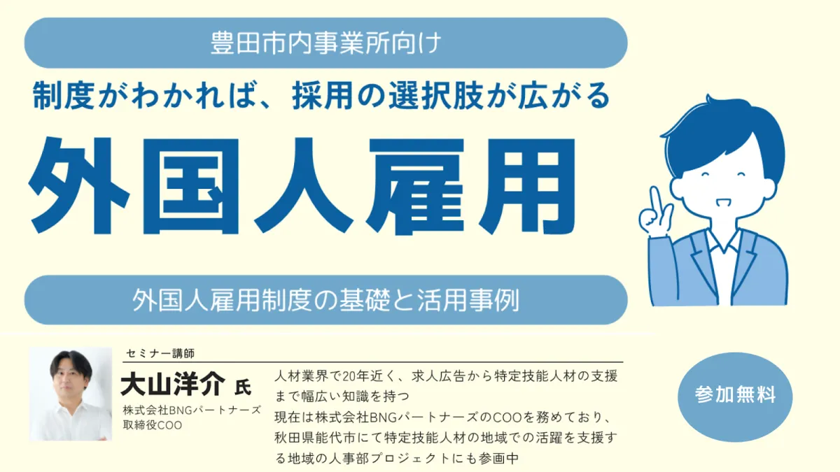 豊田市は、地域内の事業所に対する人材確保と適正な雇用の実現を目指し、「適正な外国人雇用のための制度理解セミナー」を令和7年10月23日(木)に初めて開催します。この重要なイベントでは、株式会社BNGパートナーズの取締役COO、大山洋介氏が講師として登壇します。