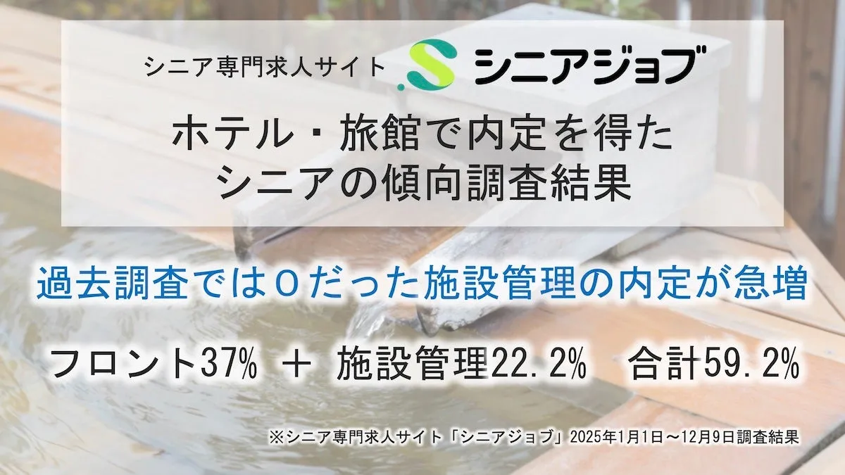 シニア向け求人サイト『シニアジョブ』を運営する株式会社シニアジョブ(東京都新宿区)が、ホテルや旅館業界におけるシニア求職者の内定状況についての調査結果を発表しました。この調査によれば、今まで0件だった施設管理の内定者が急増し、現在ではフロント業務に次ぐ内定数を記録していることがわかりました。特に、フロント職と施設管理職の合計が、ホテル・旅館の内定者の約6割を占める結果となりました。