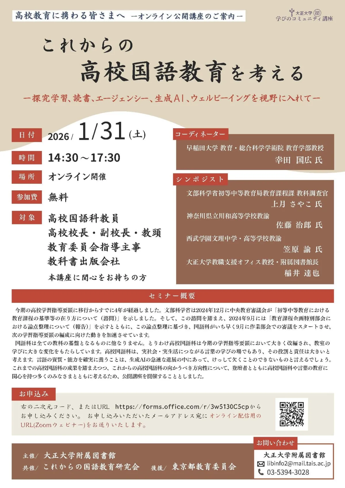 大正大学(学長:神達知純)は、2026年1月31日に高校教育に従事する方々を対象にしたオンライン講座「これからの高校国語教育を考える」を開催します。この講座は、教育の現場で重要な役割を果たす国語教育の未来について考え、共に支え合う「学びのコミュニティ」の一環です。