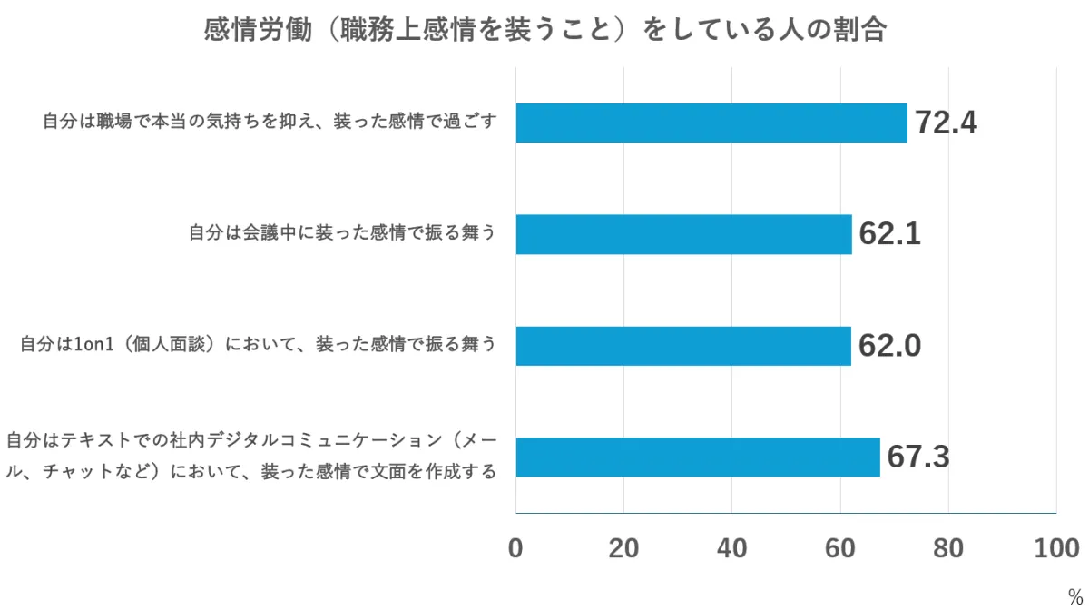 調査結果によると、職場で感情労働を実施している人は72.4%にのぼり、社内でのデジタルコミュニケーションにおいても67.3%が装った感情を用いて意見を述べていることが示されました。特に、会議や個人面談においても多数が感情労働を行っていることが確認されています。