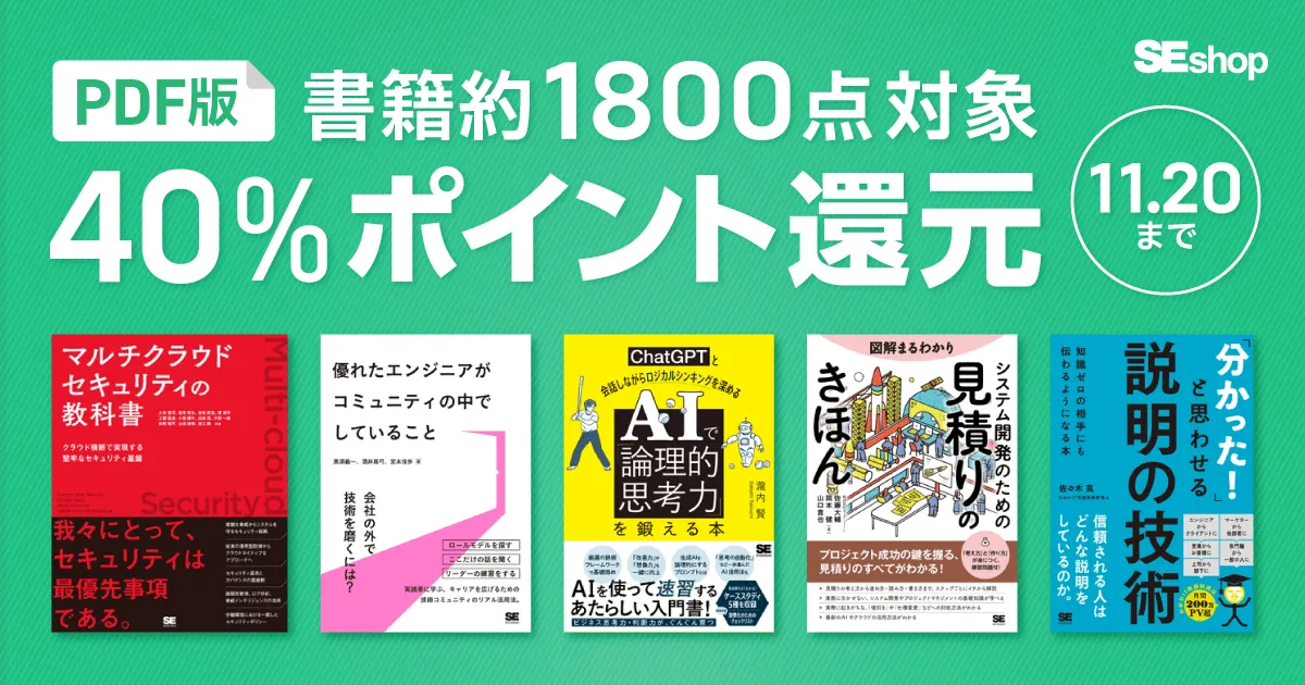 今回の「SEshop電子書籍ポイント還元フェア」は、2025年11月13日(木)から11月20日(木)までの8日間、公式サイトで開催されます。対象となるのは、約1,800点のPDF版書籍で、本体価格の40%がポイントとして還元されます。集まったポイントは、次回の購入に1ポイント=1円で利用可能です。これを機に新しい知識やスキルを得るための本を購入して、ポイントも得てしまいましょう!
