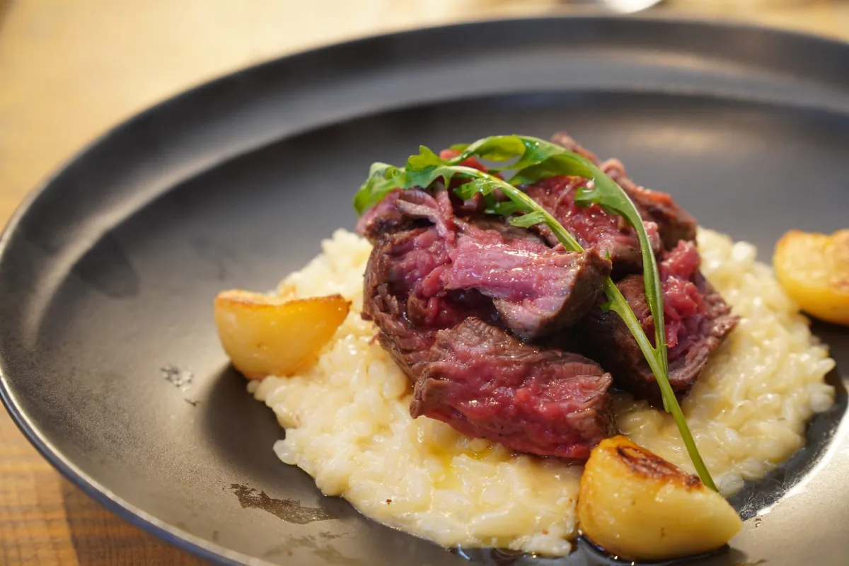 調理の過程も見どころの一つです。目の前でチーズがとろけ、芳醇な香りが広がります。この演出は、ただの食事を超え、特別な体験を提供してくれます。フランベで香ばしさを引き出した後、炊き立てのリゾットがチーズの中に投入され、あっという間に濃厚な一皿が完成します。最後に、ジューシーに焼き上げた牛フィレステーキが豪快にトッピングされ、肉が持つ旨味とチーズのコクが絶妙に絡み合います。仕上げにステーキを裂くことで、肉の風味がリゾット全体に広がろうとする瞬間は、何とも言えない幸せをもたらします。