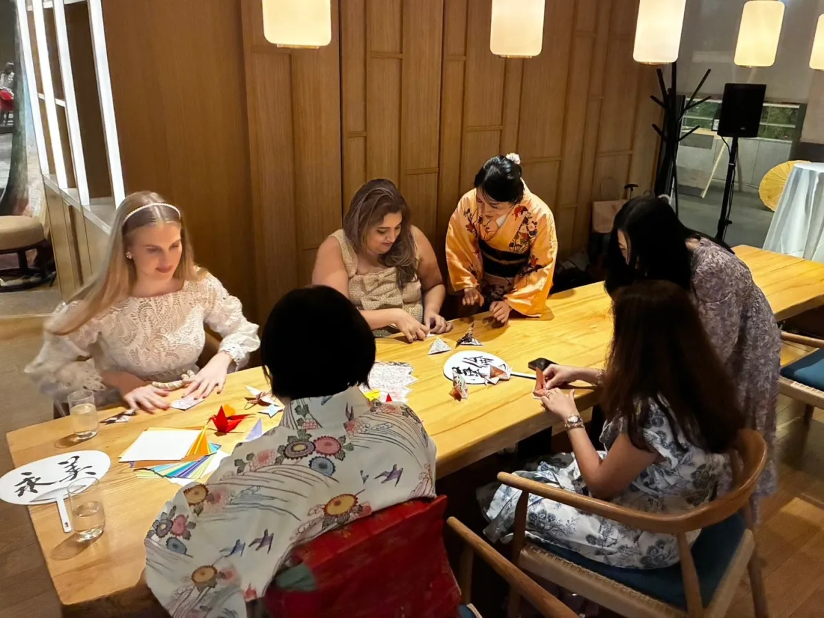 約200名が参加したこの華やかなウェディングセレモニーの中で、60名の方が抹茶と折り紙の体験ブースに参加しました。日本文化に初めて触れる人々が多く、会場は和やかで温かい雰囲気に包まれました。特別な一日を過ごす中で、参加者は日本の伝統文化を体験する重要な時間を持つことができました。