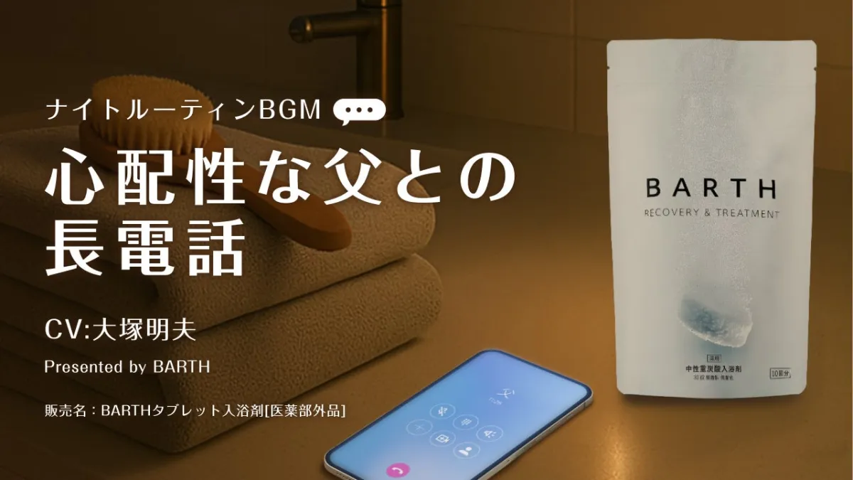 バスタイムからスリープタイムまでを特別なものにするナイトウェルネスブランド「BARTH」が、人気声優の大塚明夫さんをフィーチャーした新作睡眠用BGM「心配性な父との長電話 -105分-」を発表しました。これは、11月26日(いい風呂の日)に合わせて公開され、公式YouTubeとX(旧Twitter)で視聴可能になります。
