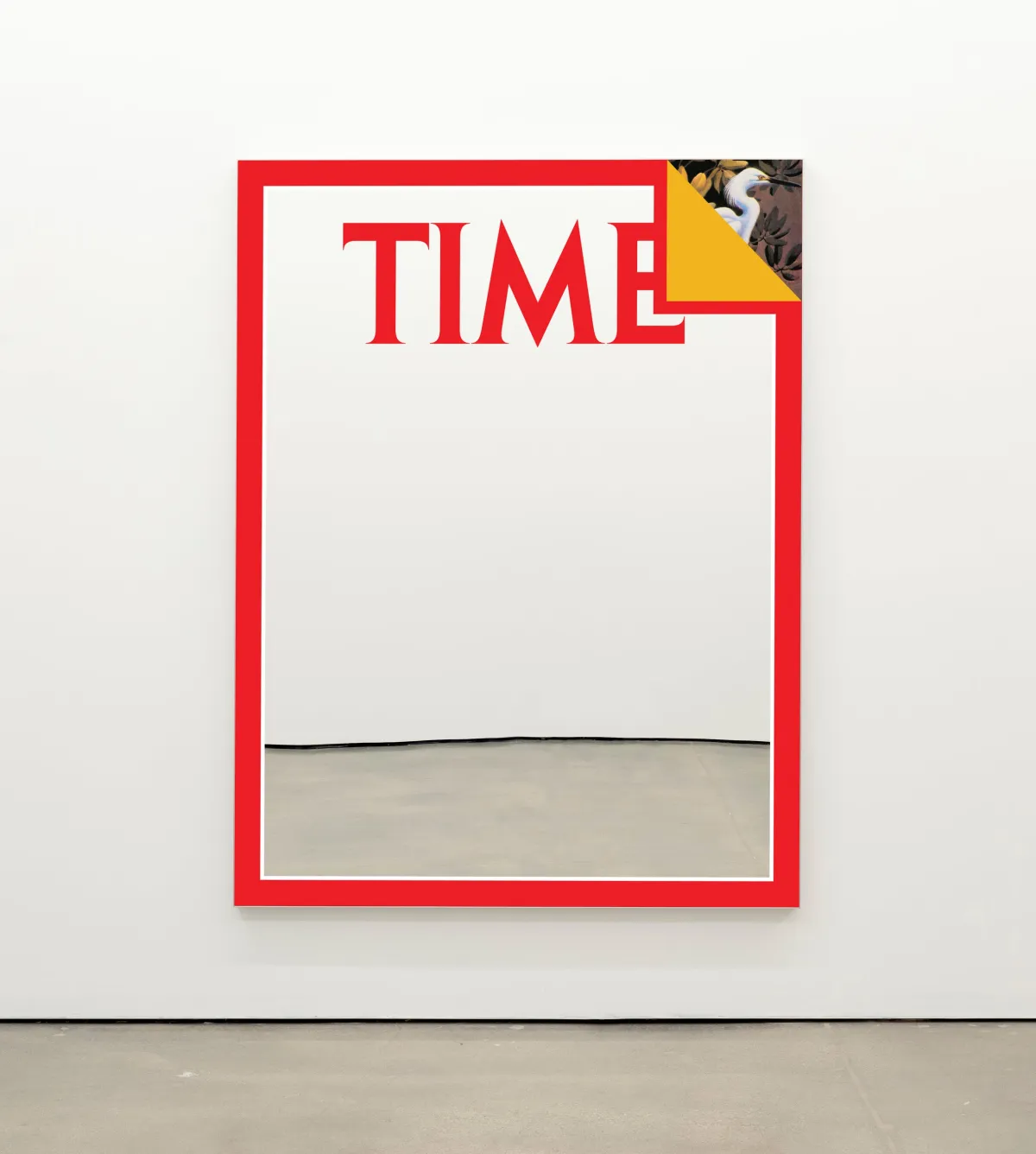 特に注目すべきなのは、トムソン氏の代表作である「TIMEミラー」シリーズのホリデー仕様にリニューアルされた新作です。この作品では等身大の鏡にアイコニックな赤いフレームやロゴ的なグラフィックが配置され、鏡の「自己の反映」という機能と、メディアが捉える「時間」や「出来事」の視覚化が巧みに重なります。鑑賞者は自身の時間との対話をすることができるため、非常に興味深い体験が提供されます。