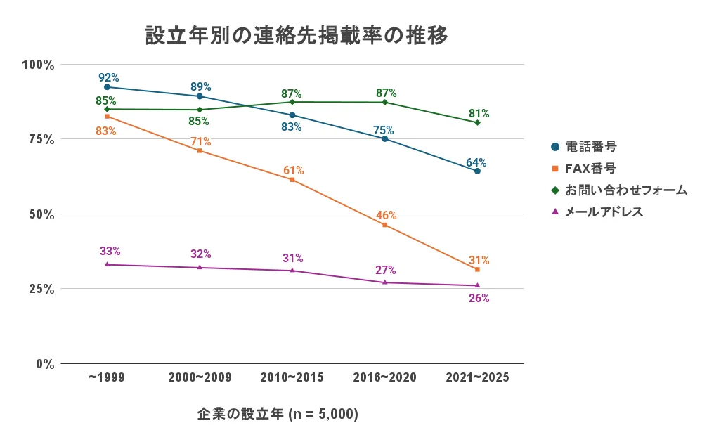 この調査の結果、特に注目すべきは新しく設立された企業における電話番号・FAX番号の掲載率の低下です。1999年以前に設立された企業と比較すると、2021年以降の企業では、電話番号の掲載率が28ポイント、FAX番号は52ポイントも低下しています。具体的な数値を見てみましょう。
