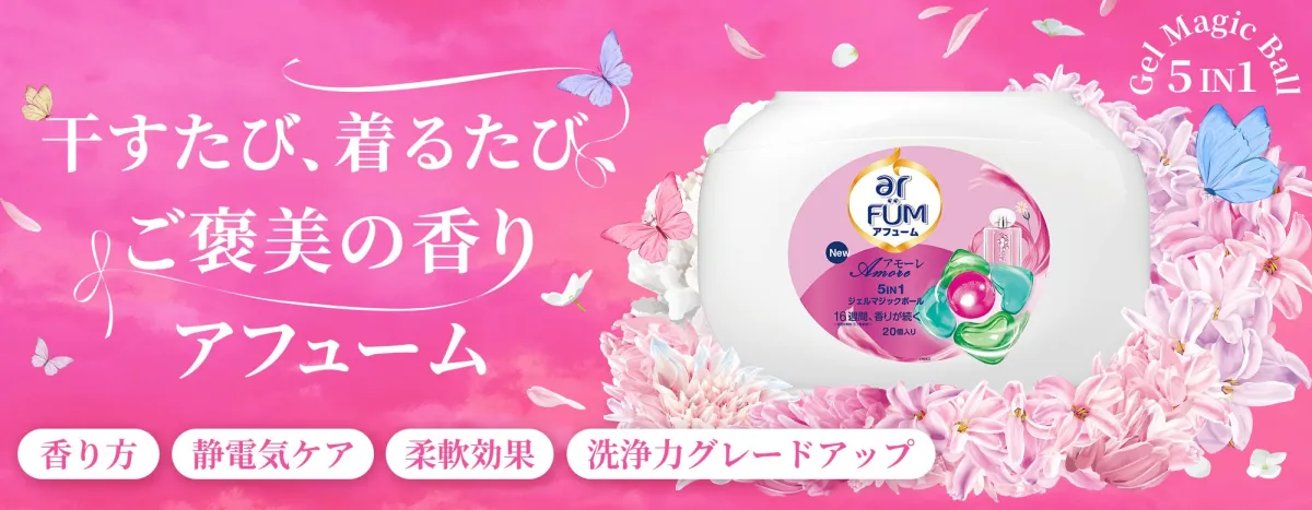 アフュームは、洗濯をもっと楽しく、華やかにするランドリーブランドです。特に、1粒の洗剤で5つの機能を兼ね備えている点が特長です。これらの機能には、洗浄、抗菌消臭、柔軟、衣類保護、持続する香りが含まれます。その華やかでふんわりとした香りの持続性が高く評価され、「映える洗剤」としても人気を集めています。