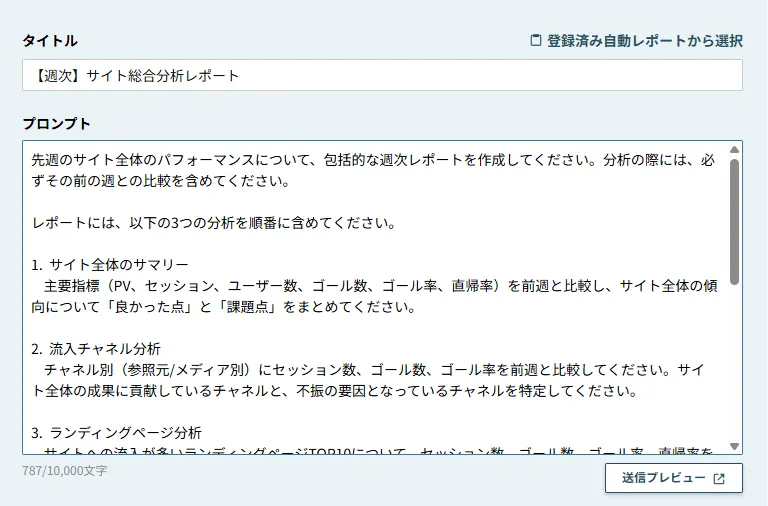 この新機能の最大の魅力は、ユーザーが自然言語でプロンプト(分析指示)を入力することで、AIがそれを理解しレポートを作成する点です。たとえば、「先週のサイトパフォーマンスのサマリーを教えて」といった具体的な指示を提供するだけで、AIが意図を汲み取り、必要なデータを集計し、自動的に分析結果を報告してくれます。さらに、プロンプトは過去の自動レポートやテンプレートから引用可能なので、手軽に設定できます。