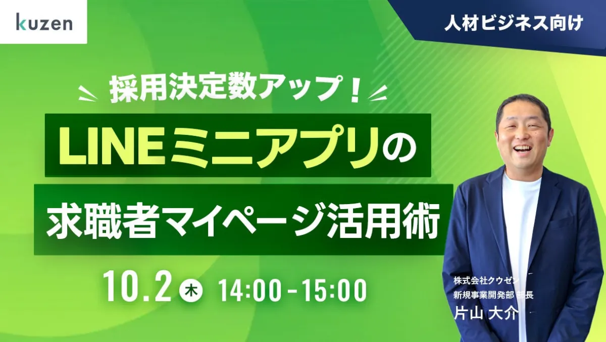 クウゼンは、この新しいサービスの利用方法を広く知ってもらうために、特別な無料ウェビナーを開催します。開催日時は2025年10月2日、8日、9日のいずれも14:00から15:00です。このウェビナーでは、ミニアプリを活用した求職者マイページの効果や導入事例について詳しく解説されます。