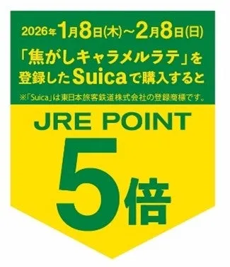 このキャンペーンは、2026年1月8日から2月8日までの期間中、JRE POINT WEBサイトに登録したSuicaを使って、プラスアキュアの自販機で焦がしキャラメルラテを購入することで、通常の5倍のポイントがもらえるというもの。参加するのはとても簡単で、ただ自販機でこの人気ドリンクを手に入れるだけで、すぐにポイントが貯まります。