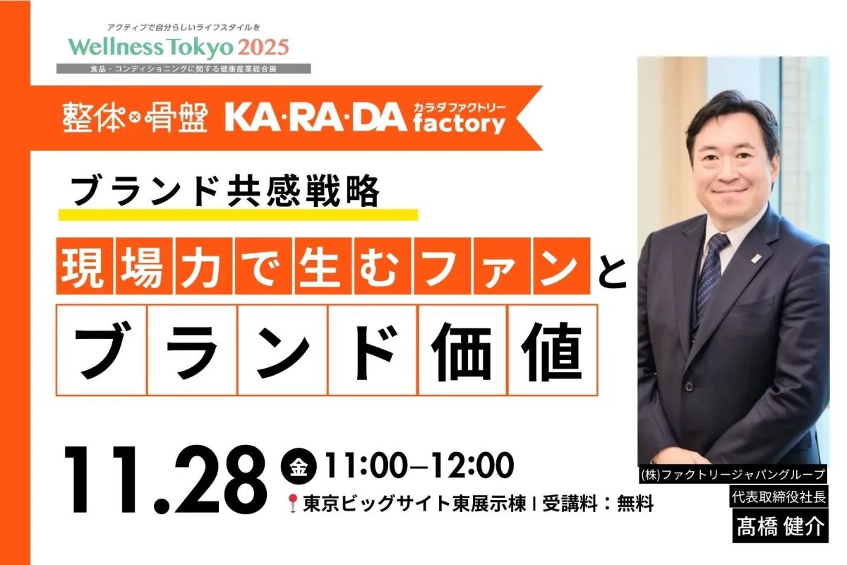 2025年11月28日(金)、東京ビッグサイトにて、「現場力で生むファンとブランド価値~整体×骨盤 カラダファクトリーのブランド共感戦略~」をテーマにしたセミナーが開催されます。このセミナーは、整体×骨盤サロン「カラダファクトリー」を運営する株式会社ファクトリージャパングループが主催し、心と体の健康づくりを考える、ウェルネス産業の現在と未来にアプローチする内容となっています。