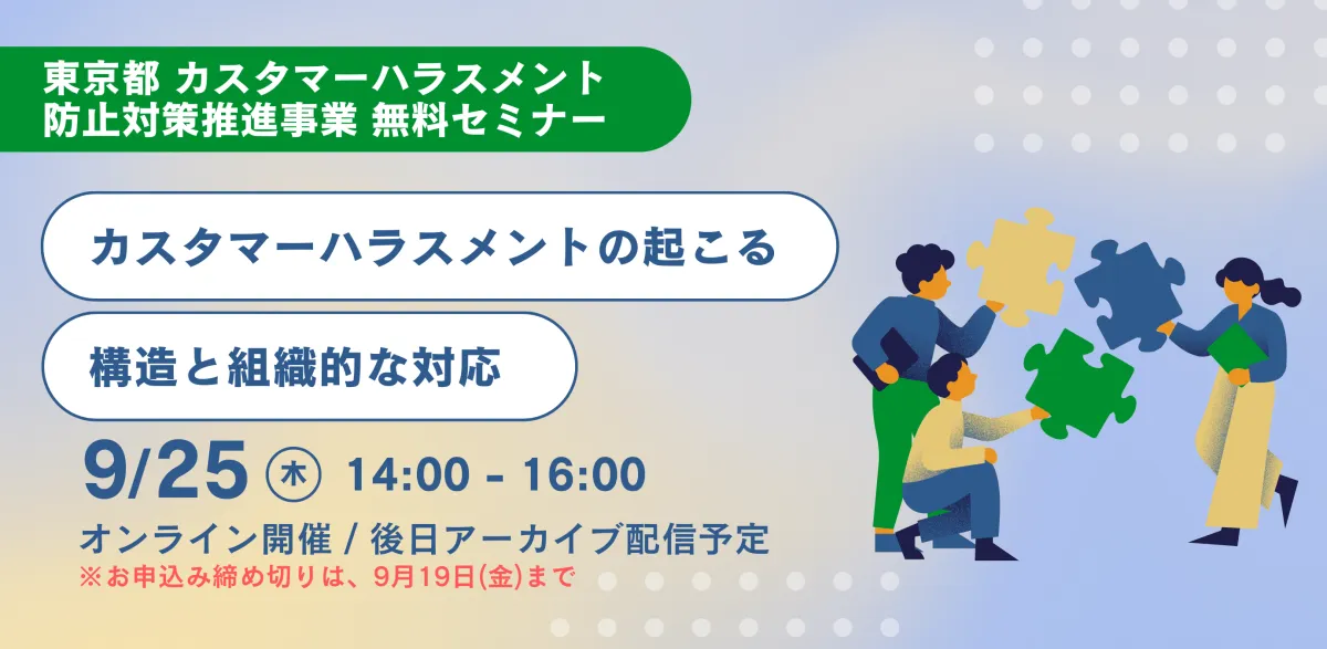 東京都では、企業や団体におけるカスタマーハラスメントへの理解を深め、具体的な対応力を高めることを目的としたセミナー「カスタマーハラスメントの起こる構造と組織的な対応」を開催します。このセミナーは、2025年9月25日(木)の14:00から16:00にオンラインで行われ、参加費は無料です。参加希望の方は、2025年8月20日(水)から9月19日(金)までに申し込みを行ってください。