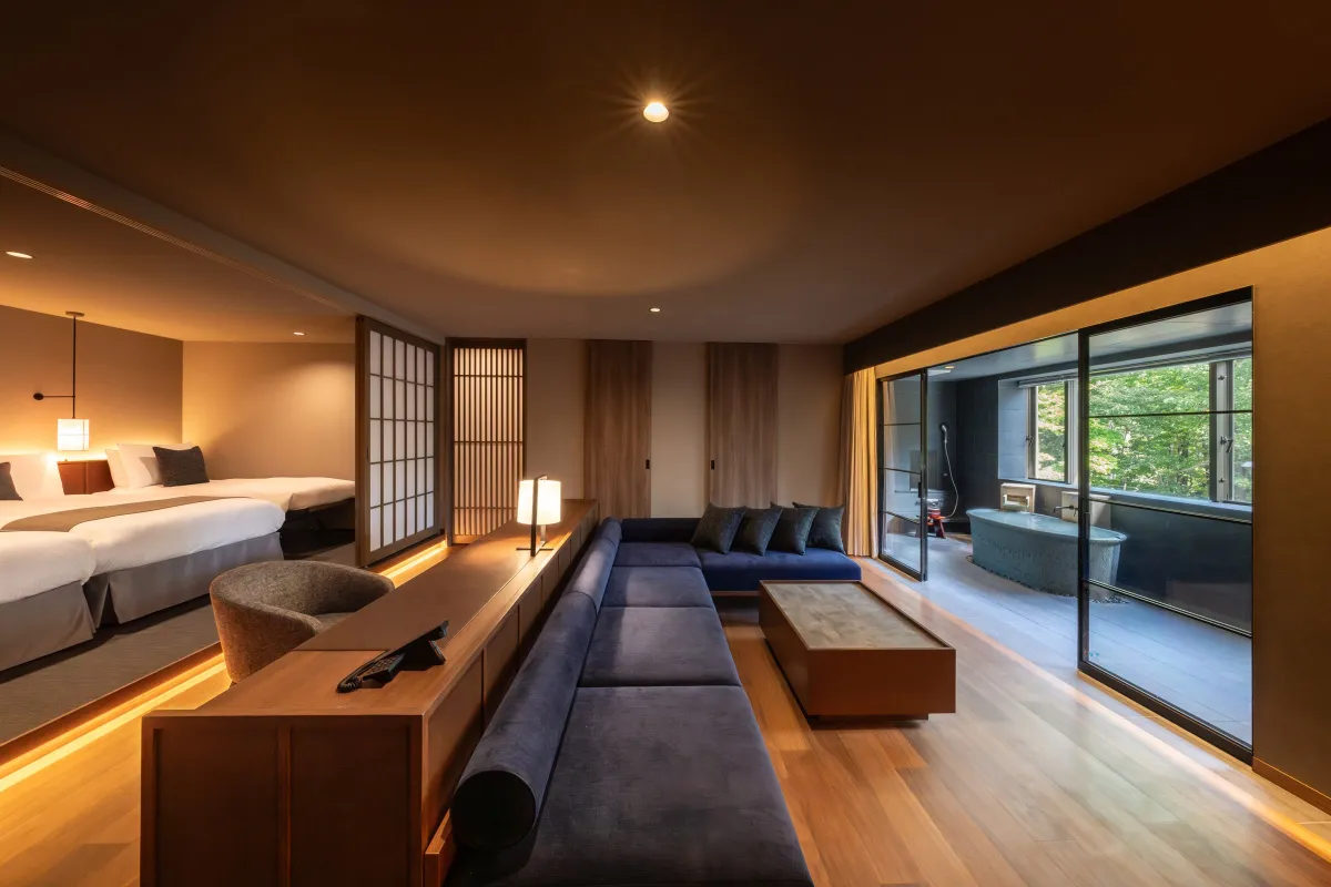 お食事は、那須の旬の食材をふんだんに使用した和のフルコース。料理長が心を込めて仕立てた一皿一皿は、五感で感じる贅沢なひとときを演出します。さらに、ゲスト専用ラウンジでは厳選されたお酒や飲み物を楽しむこともでき、特別な滞在をより一層引き立ててくれます。