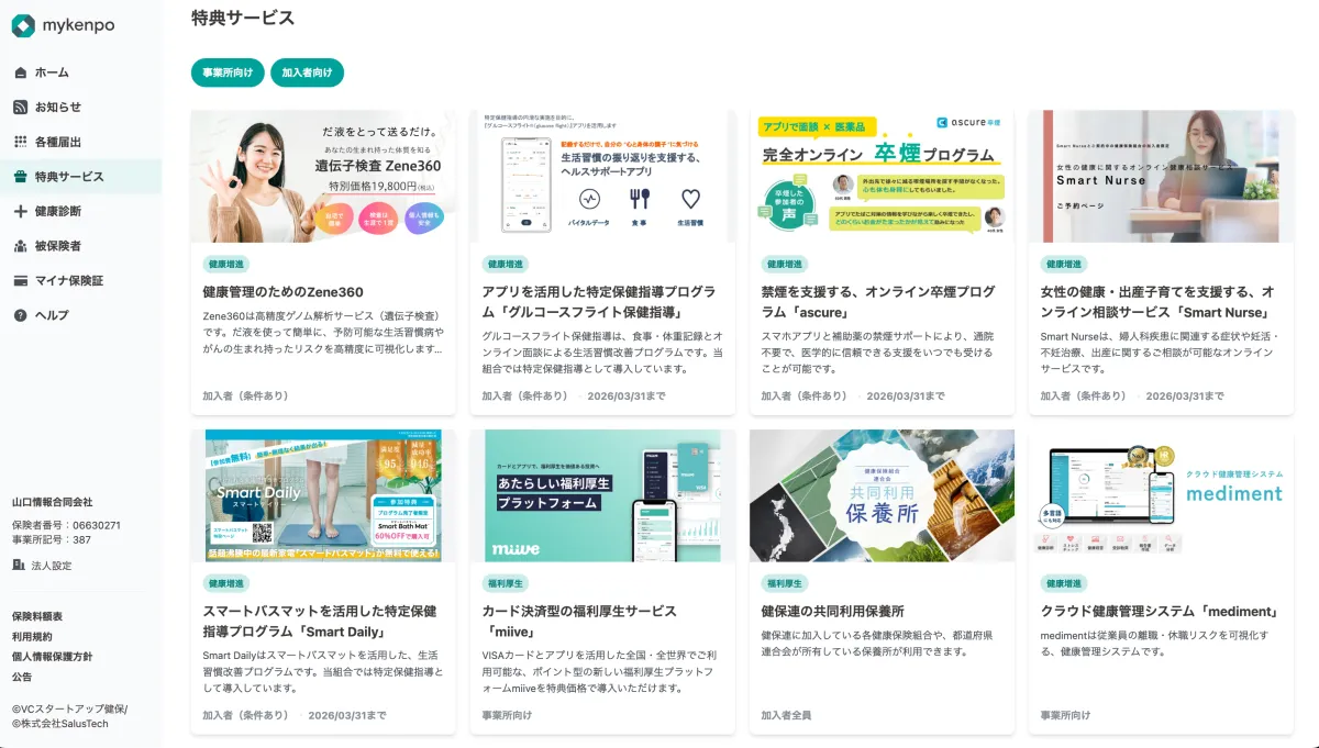 特典サービスは、ヘルスケアや福利厚生分野において先進的なサービスを提供するスタートアップとのコラボレーションによるもので、加入者が利用できる特典が用意されています。割引料金での各種サービス提供や、組合が負担する形での無料利用が可能となるため、加入事業所やその従業員にとって大きなメリットが期待できます。