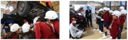 続いて、学生たちは工場見学に移動しました。そこで彼らは点検作業やエンジンオイルの交換など、実際の整備現場を目の前で見学しました。多くの子どもたちがエンジンルームやタイヤ交換の作業を見て、真剣な表情を浮かべています。この体験を通じて、自動車がどのように整備され、どのように維持管理されるのかを直に学ぶことができました。