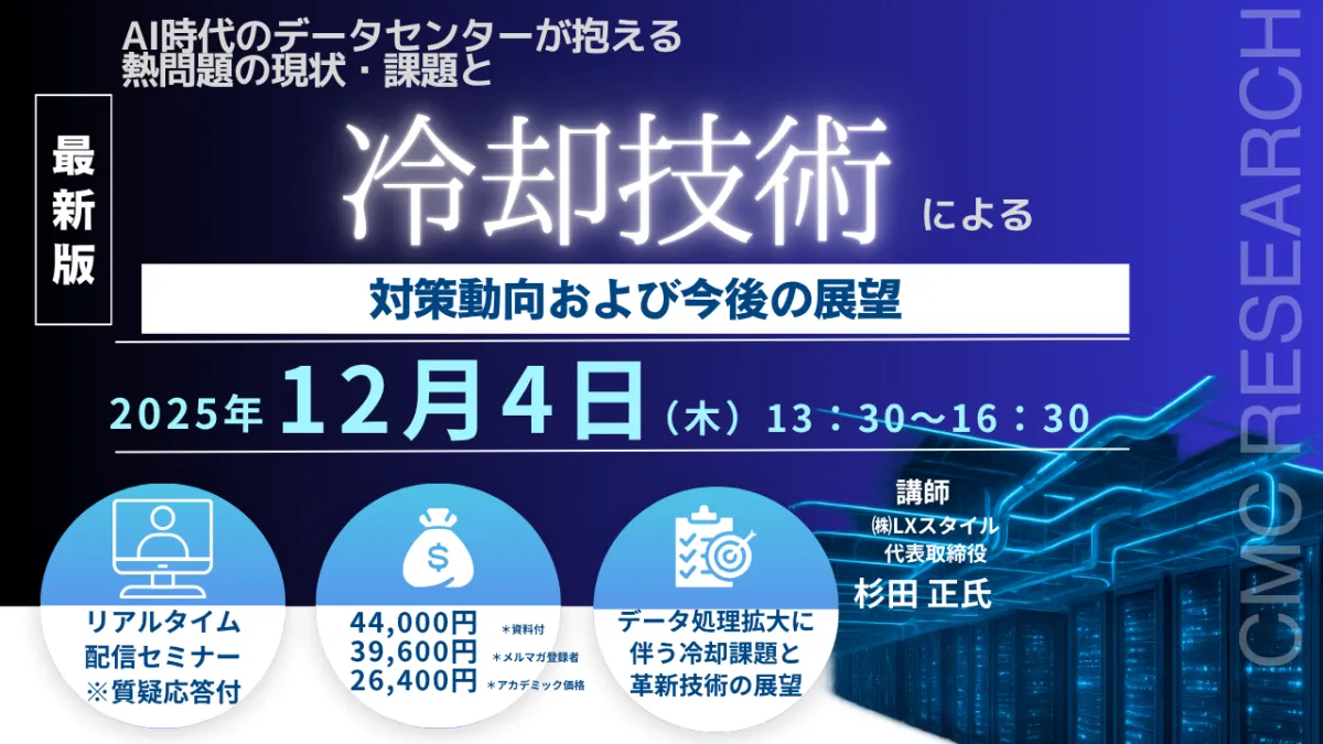 データセンターは、現代のIT社会を支える重要なインフラの一つですが、近年のサーバー性能の向上や高密度化、さらには生成AIの普及に伴い、その運営には新たな課題が生じています。このような背景の中、シーエムシー・リサーチが主催するセミナー「AI時代のデータセンターが抱える熱問題の現状・課題と冷却技術による対策動向および今後の展望」が、2025年12月4日(木)に開催されます。講師にはデータセンター省エネ技術の専門家である杉田正氏(㈱LXスタイル代表取締役)が登壇します。