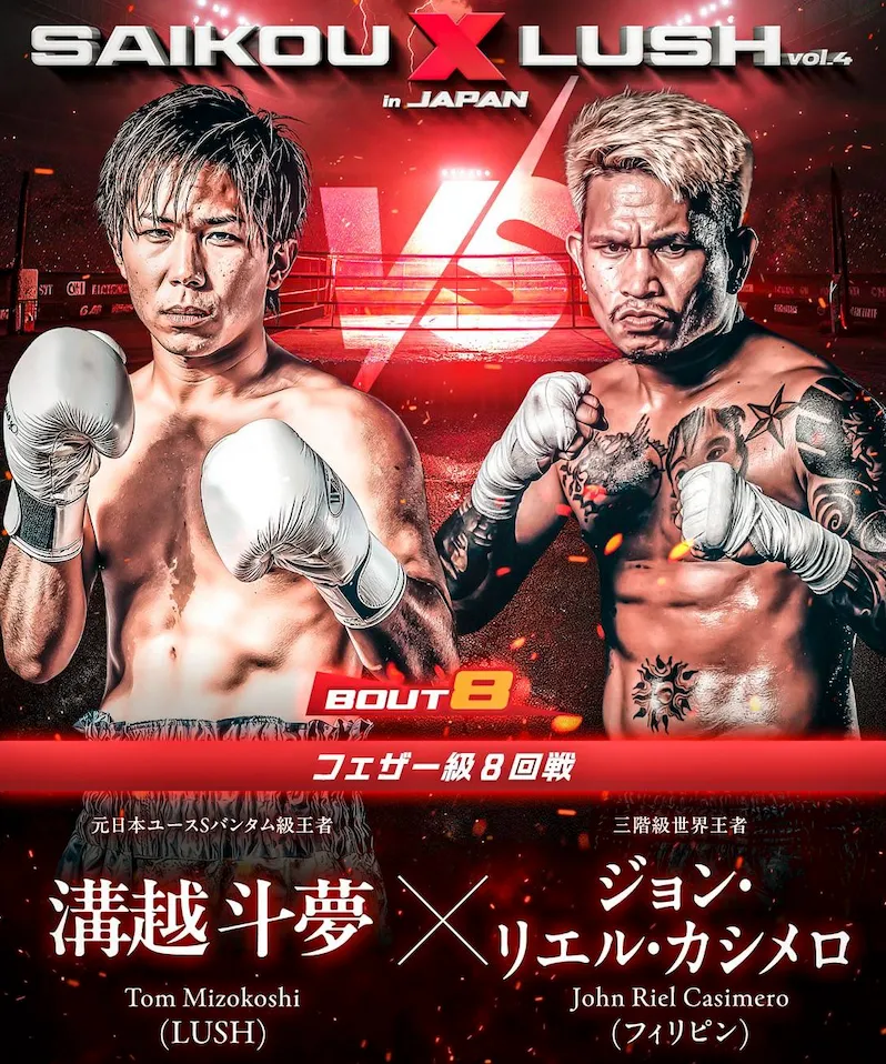 目玉の試合は、元世界3階級制覇王者のジョン・リエル・カシメロが、LUSH選手の溝越斗夢と対戦するフェザー級8回戦。カシメロ選手は、過去の10月の試合で亀田京之介選手に敗れた屈辱を晴らす大事な一戦に臨みます。フィリピン出身のカシメロ選手は、世界の舞台で数々の栄光を手にしてきたボクシング界の鬼才です。